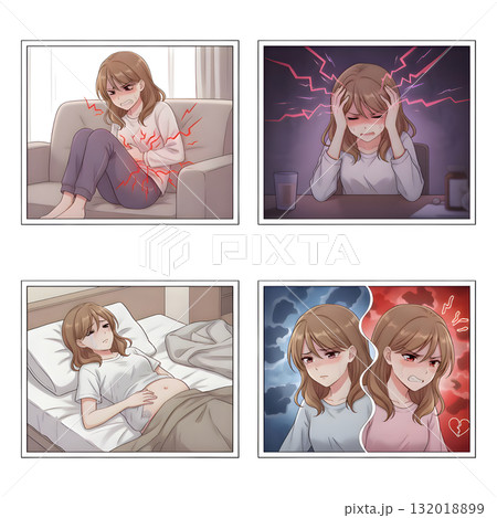 Woman suffer from stomach ache, headache and other period symptoms. Menstrual cramp or endometriosis abdominal pain concept. illustration design.