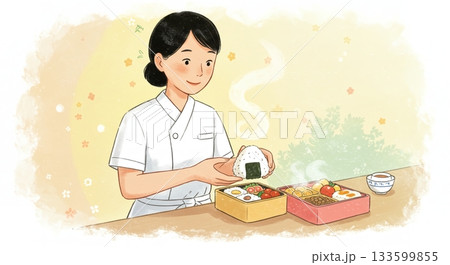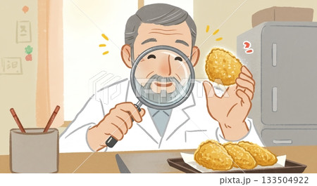圖畫書風格。一位男性工作人員在食品工廠裡用溫暖的語氣檢查食品。