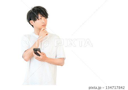一位年輕的亞洲男子一邊看著智慧型手機,一邊思考、考慮、擔憂