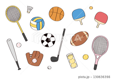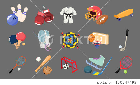 Sports equipment set cartoon illustration on gray isolated background . Vector .