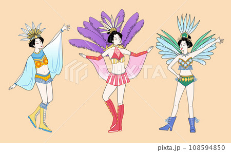 Set collection of female Brazilian samba dancers. Woman in carnival costume. Vector flat illustration