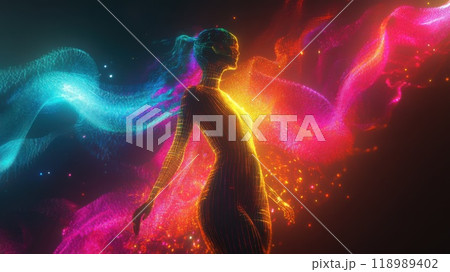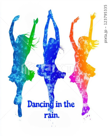 This vibrant and colorful illustration shows three figures dancing in the rain, each represented with bright and vivid colors like green, blue, and red, creating a sense of freedom and joy.