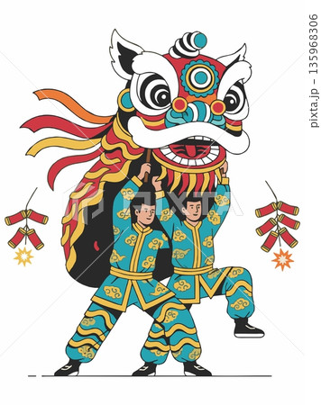 Illustration of a traditional Chinese lion dance performance