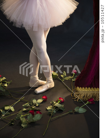 Teenage (16-17) ballerina on stage, roses by her feet