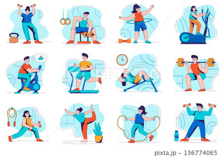Fitness at gym concept isolated person situations. Collection of scenes with people do aerobics or weightlifting, exercise on simulators, home workouts. Mega set. Vector illustration in flat design