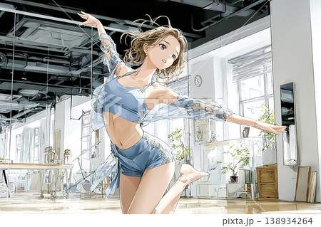 一名年輕女子在體育館的舞蹈課上跳舞的插畫素材