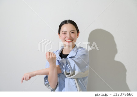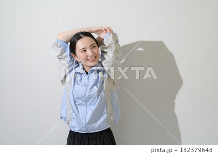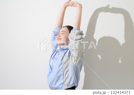 白色背景下伸展身體的日本女性