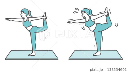 一組插圖對比了身材完美的女性微笑地做瑜珈舞者姿勢和身材豐滿的女性努力做同樣動作的對比。