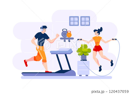 A man runs on treadmill and a woman jumps rope.