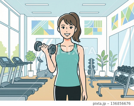 插圖描繪了一位二十多歲的女性在健身房用啞鈴進行訓練。