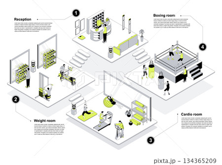 Fitness gym 3d isometric concept in outline design for web. People registering at sport center hall, training at cardio treadmills area, boxing or weightlifting isometry rooms. Vector illustration.