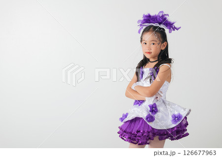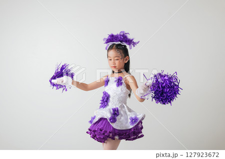 Little girl in a purple feather headpiece, wearing a cheerleader costume with a white and purple layered skirt. She stands confidently with arms crossed. Studio shot on a white background