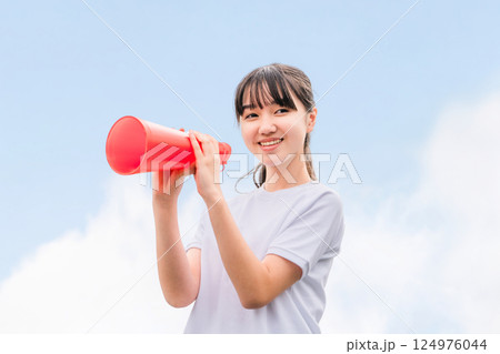 在教室和教學大樓裡用擴音器歡呼的女性(學生、女國中生、女高中生)