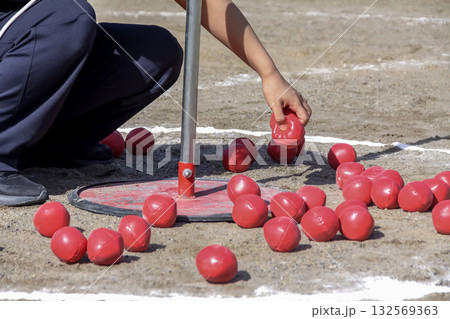 紅隊幼兒園老師正在為投擲球比賽做準備 [秋季運動會圖片]