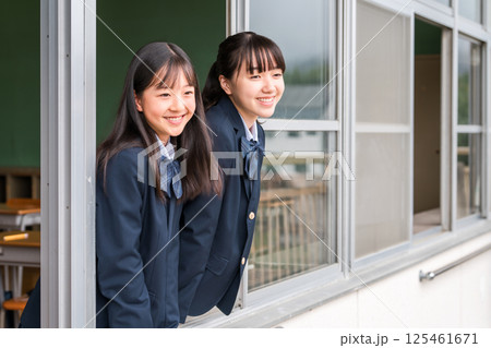 國中和高中的女生在教室窗外歡呼