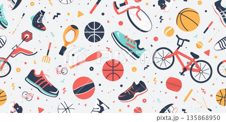 Dynamic Motion: Seamless Pattern Incorporating Sports Icons, Basketballs, Bicycles, and Running Shoes
