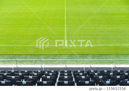 Empty football stadium with green field and spotlights. The field is ready for a game