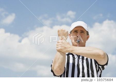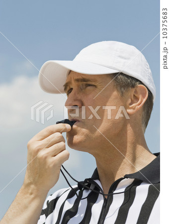 Male referee blowing whistle