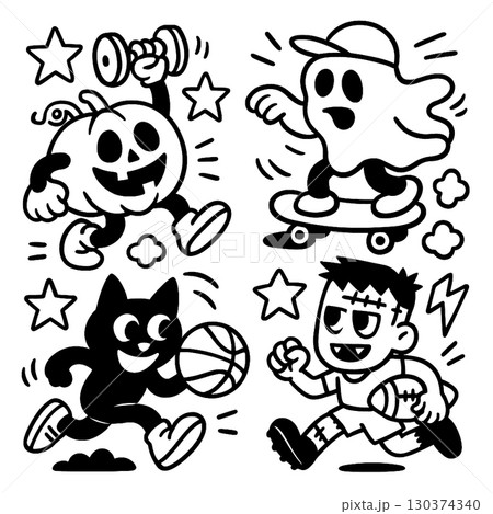 Isolated separated layered lineart outline of cartoon characters skateboarding cycling playing