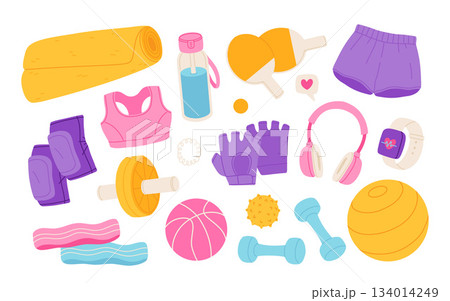 Sport equipment, gym and fitness stuff set. Workout accessories, objects. Balls, tennis rackets, mat, bag, dumbbell. Flat graphic vector illustration isolated on white background
