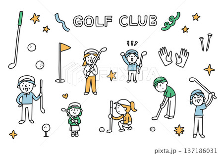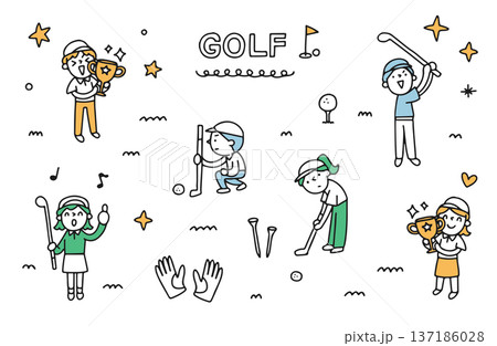 一組描繪男女高爾夫球手和老年球童的全身插畫。