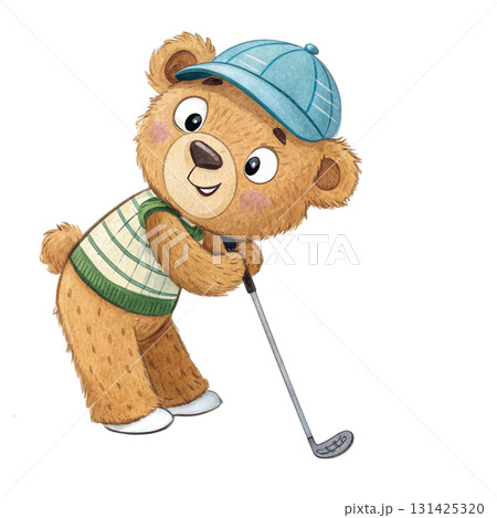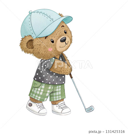 Cute watercolor cartoon of a teddy bear playing golf, light blue cap