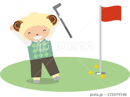 一幅描繪羊(羊年)角色專注於高爾夫球推桿的插圖素材