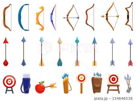 Archery shoot weapon icons set cartoon vector. Arrow game