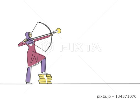 Continuous one line drawing Arab businesswoman archery arrow with lightbulb tip, one foot rest on pile of coins. Focus on profit. National Creativity Day. Single line draw design vector illustration