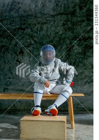 Vertical image of girl wear fencing sport uniform also hold epee and sit on wooden bench to relax after practice for the competition.