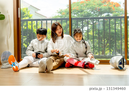 Asian mother, son and daughter as family sit on the floor in front of glass door with girl relax with smiling and boy enjoy the mobile phone.