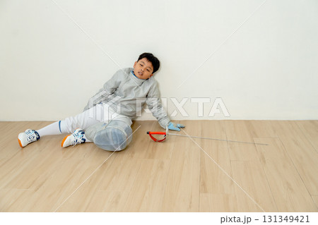 Asian boy with fencing sport uniform sit on the floor and look tired also relax after practice for competition.