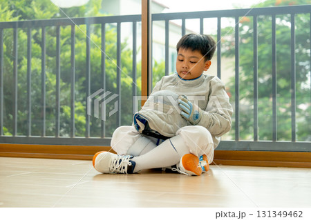 Side view of Asian boy sit on the floor in front of glass door near balcony of his house also hold helmet of fencing sport with soft light.