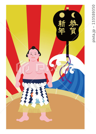 新年賀卡,橫綱站在相撲台上-浮世繪風格的波浪和初升的太陽作為背景