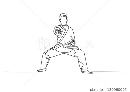 Single one line drawing male karate athlete in strong defensive stance. Symbolizing power, discipline, and self-defense aspect of martial arts. Continuous line draw design graphic vector illustration