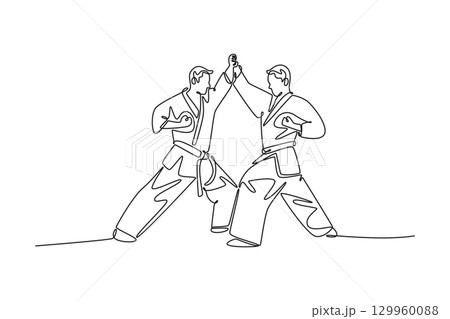 Single continuous line drawing two male athletes are engaged in karate duel. symbolizing the strategic clash between powerful kick and punch. Dynamic one line draw graphic design vector illustration