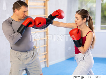 Young girl training boxing with partner during sports classes