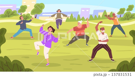 Tai chi group. Qigong exercise, senior old people class yoga gymnastics sport outdoor nature park man woman body health wellness fitness stretching, classy vector illustration