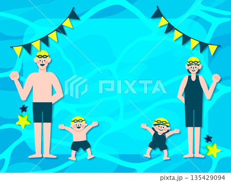 圍成一個圈!今年,讓我們一起掌握游泳吧!小學生與游泳套裝的插畫素材
