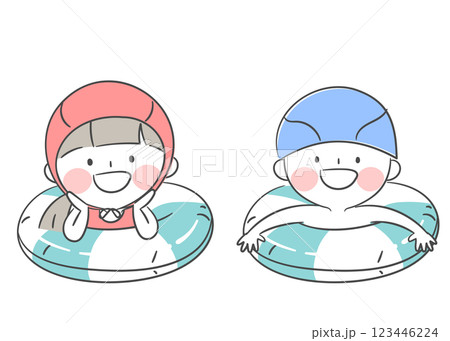 圍成一個圈!今年,讓我們一起掌握游泳吧!小學生與游泳套裝的插畫素材