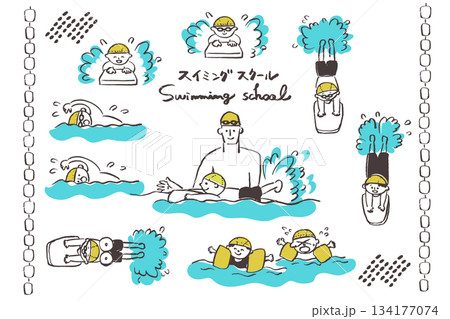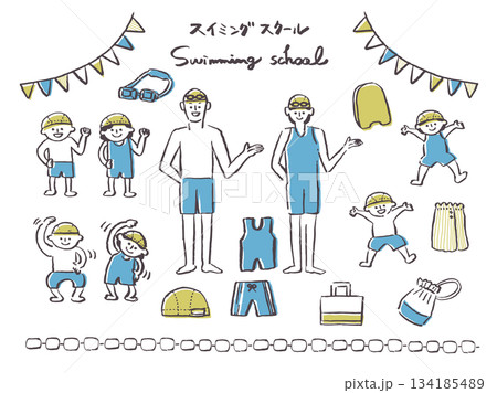圍成一個圈!今年,讓我們一起掌握游泳吧!小學生與游泳套裝的插畫素材