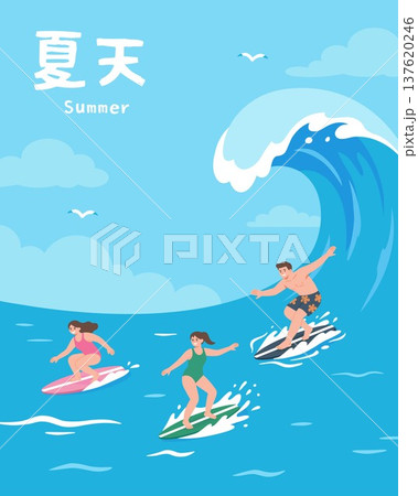 Summer Surfing Lifestyle Illustration with Large Ocean Wave