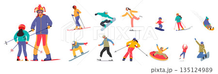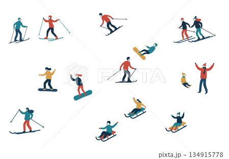 Set Characters Engage In Vibrant Winter Sports In A Snowy Wonderland. People Skiing, Snowboarding, Sliding, Ice Skating