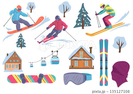 Ski resort equipment set in flat graphic design. Collection elements of skis, snowboard, cable car, glasses mask, village houses, forest trees, extreme sports characters, other. Vector illustration.