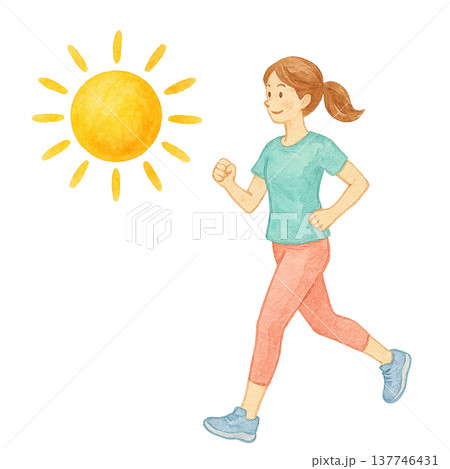 在陽光明媚的日子裡,一位女士正在慢跑鍛煉,水彩插圖