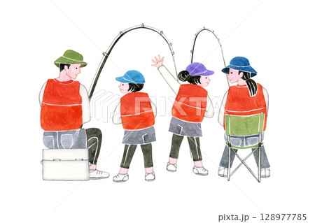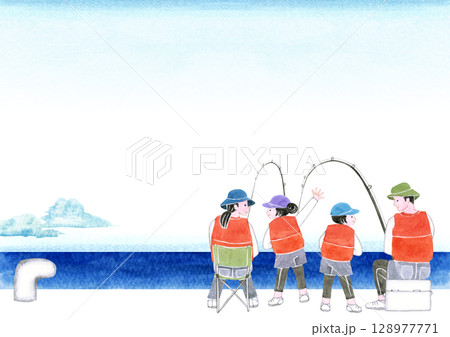 海釣 釣魚人 家庭背景 水彩插圖