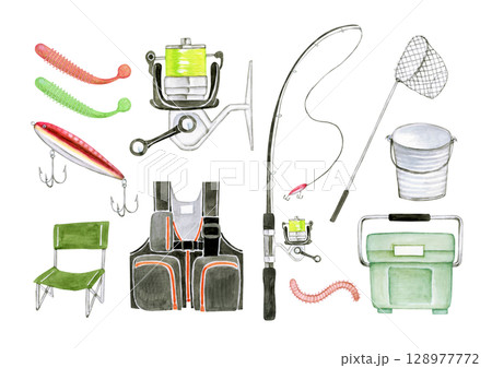溪流釣魚、河釣、釣魚套裝、水彩插圖