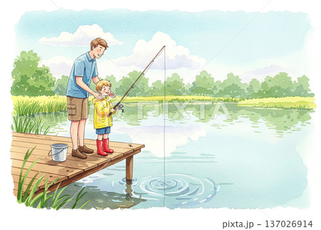 一幅水彩插畫,描繪了一位父親在湖邊碼頭上教兒子釣魚的場景。