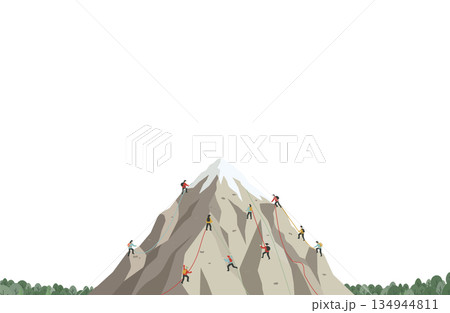 扁平化設計的插畫,描繪了人們用繩索攀爬懸崖的場景。