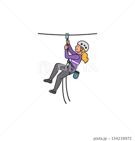 Adventurous young woman enjoying a thrilling zipline experience amidst a sunny sky, showcasing
